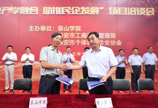 泰安市委副書記張濤,山東省工商局黨組成員、副局長(zhǎng)郭之祥,泰山學(xué)院黨委書記范真,泰安市工商局黨組書記、局長(zhǎng)張京洲,泰山學(xué)院黨委副書記李玉洋,副院長(zhǎng)王雷亭、于鴻遠(yuǎn)、徐躍,泰安市各縣市區(qū)工商局負(fù)責(zé)人出席洽談會(huì)。泰山學(xué)院黨委副書記、院長(zhǎng)秦夢(mèng)華主持洽談會(huì)。泰山學(xué)院專家教授與380余位泰安市民營(yíng)企業(yè)家齊聚一堂,共商校企合作,助推地方經(jīng)濟(jì)社會(huì)發(fā)展大計(jì)。